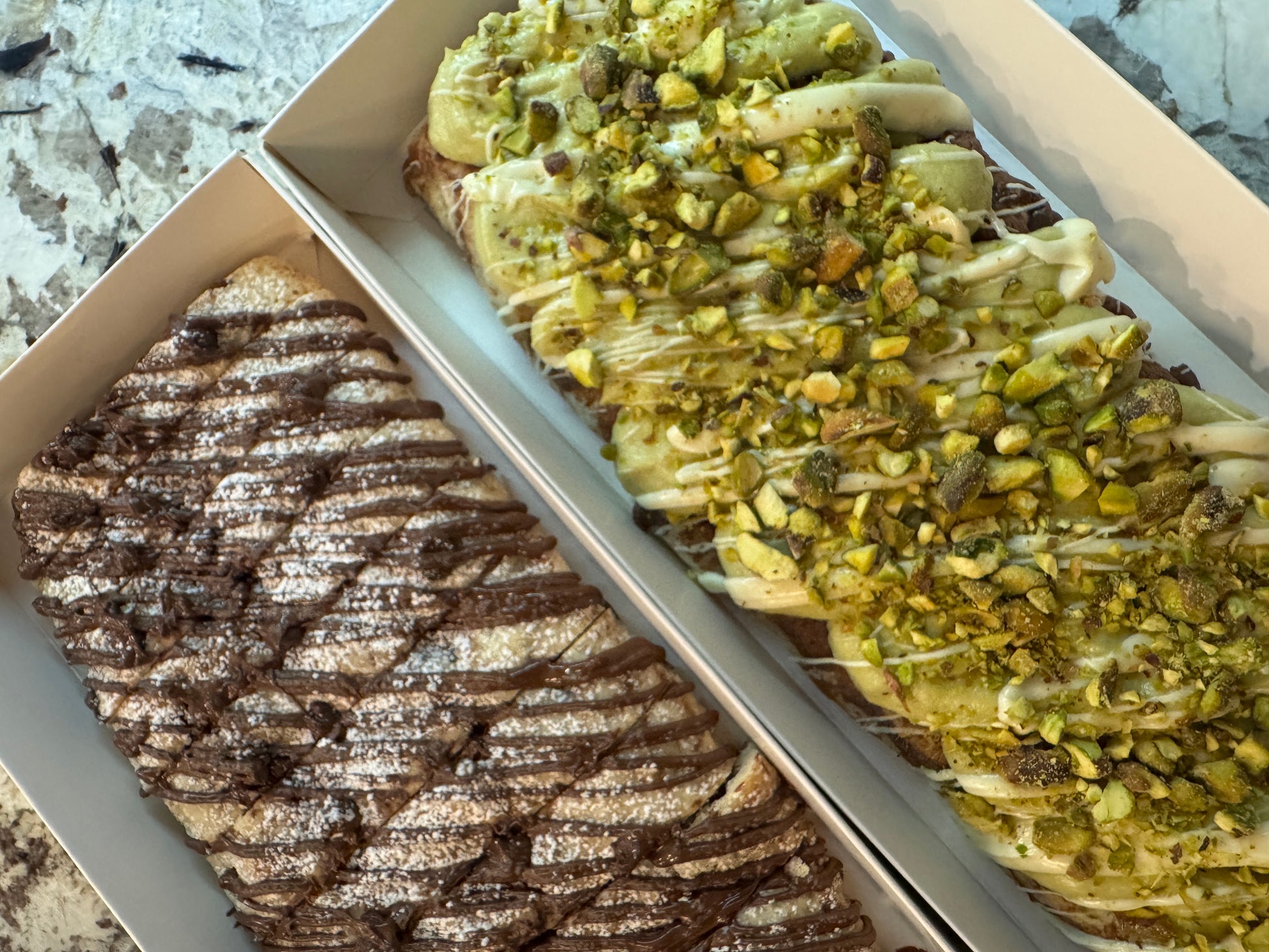 Our signature Nutella-filled chewy biscotti is topped with a silky pistachio-mascarpone cream that’s light, smooth, and perfectly balanced. Each log is finished with a delicate white-chocolate drizzle and a sprinkle of roasted pistachios for added texture and fragrance.